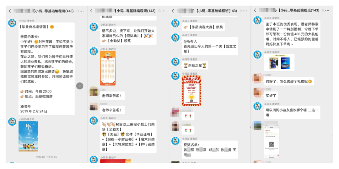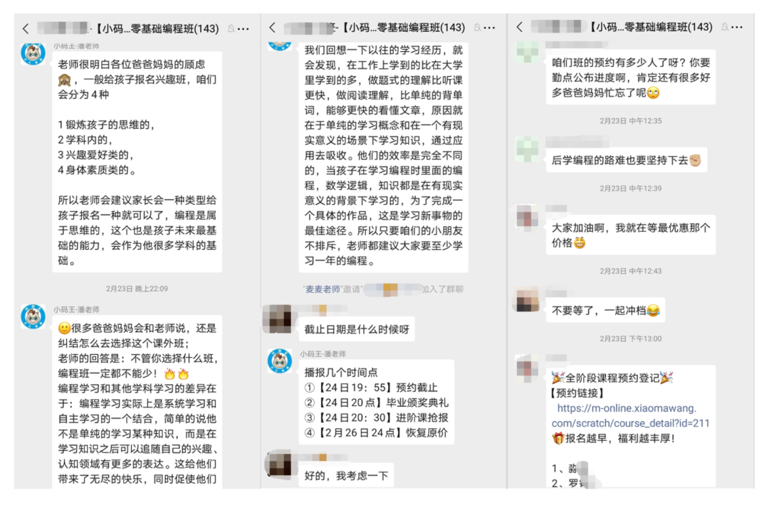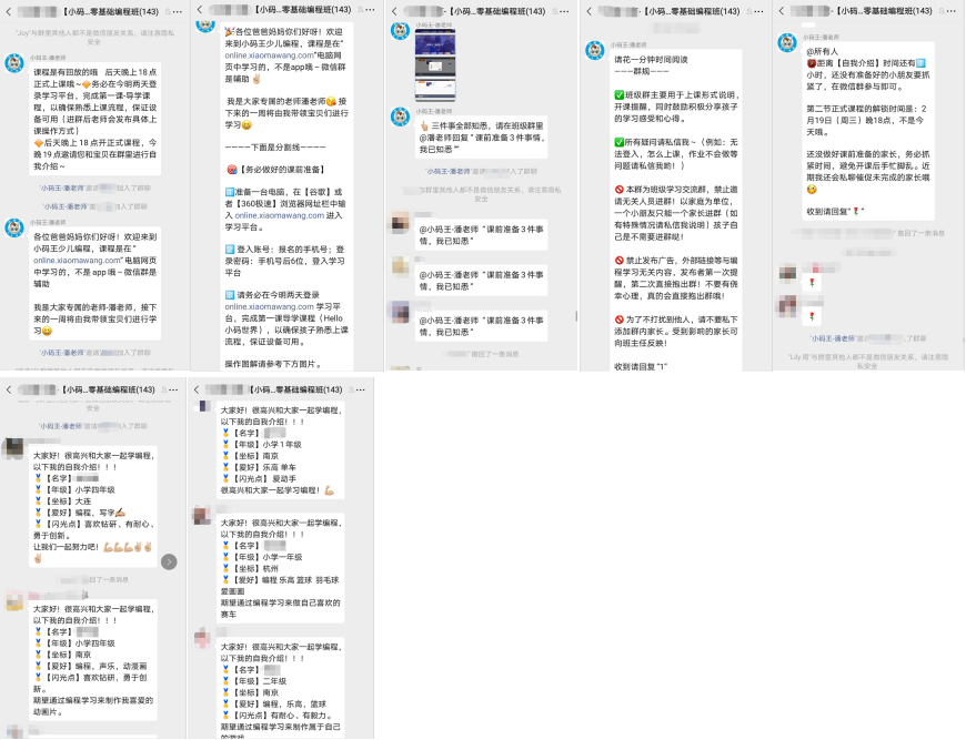 對于小碼王第一次純線上嘗試從體驗課到正價課的模式,我覺得它的社群運營流程很不錯。硬要挑的話,建議進群環(huán)節(jié)的進群歡迎語,講清楚三件事情:上課時間+上課方式+社群規(guī)則,一次說完整;小碼王這里是分多次去講述的。