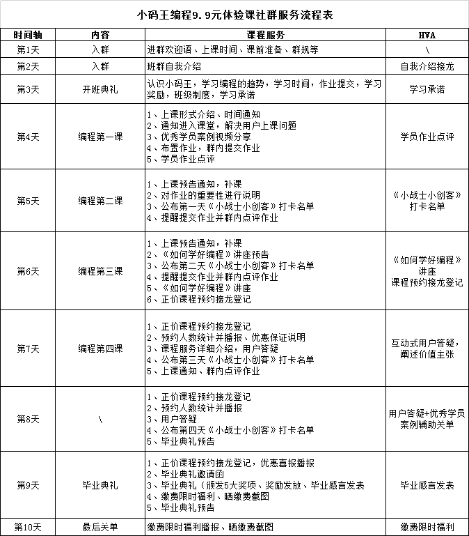 從小碼王的運營節(jié)奏來看,訓練營產(chǎn)品的7個運營環(huán)節(jié):進群環(huán)節(jié)、開營儀式、上課環(huán)節(jié)、作業(yè)環(huán)節(jié)、社群活動、轉(zhuǎn)化環(huán)節(jié)、閉營儀式;它都做的很好,能讓用戶在每個環(huán)節(jié)產(chǎn)生HVA。