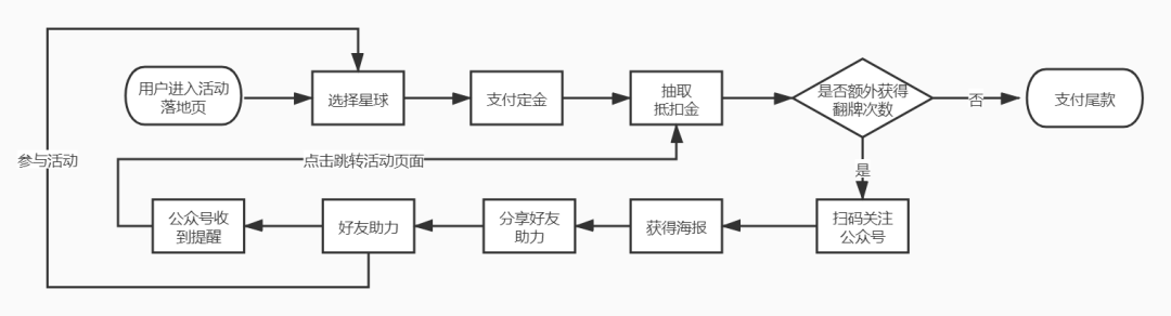 活動(dòng)期間用戶預(yù)先完成目標(biāo)星球的定金支付(星球不同金額不同)就可以抽取高額不等的抵扣金,結(jié)合海報(bào)裂變分享,每邀請一位好友助力即可獲得一次抽獎(jiǎng)機(jī)會(huì),無上限抽取抵扣金,