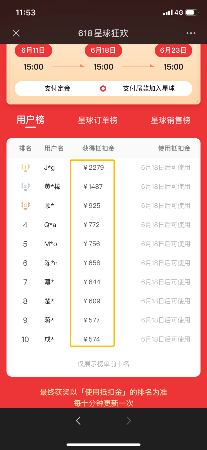 另外還有一個(gè)【使用抵扣金】排行榜,每十分鐘更新一次,活動(dòng)期間使用抵扣金數(shù)額前十的用戶,可以獲得實(shí)物獎(jiǎng)勵(lì),具體獎(jiǎng)勵(lì)如下: