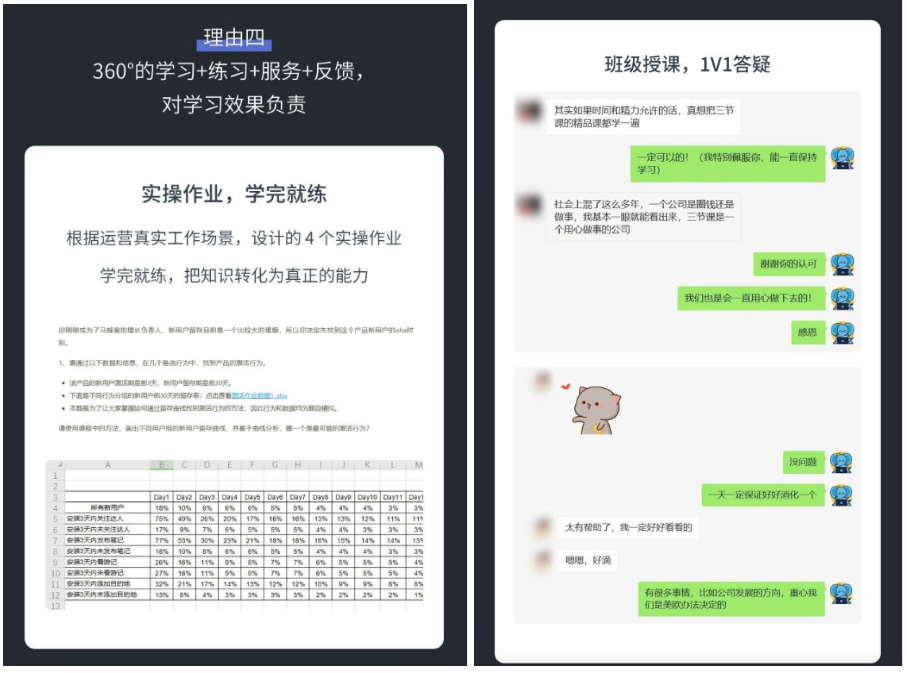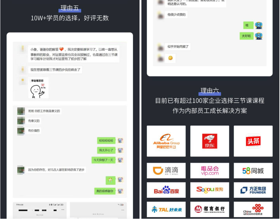 真實案例驅(qū)動教學(xué),讓學(xué)生真正做到學(xué)以致用,并且通過展示優(yōu)秀學(xué)員的精致作業(yè),來實質(zhì)化的展現(xiàn)課程可以帶給你的價值與提升;并且還有練習(xí)+服務(wù)+反饋,讓你真正做到學(xué)以致用;同時,這里使用了微信聊天記錄截圖,來表示服務(wù)的真實性;