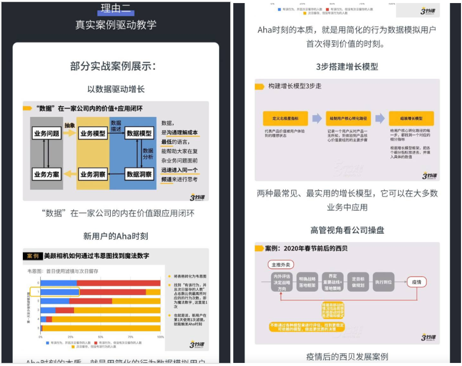 通過幾大理由的敘述,很好的解決了用戶的焦慮問題;例如理由2,真實案例驅(qū)動教學(xué);做運營的同學(xué)都清楚,理論知識都看的不少,但是實際操作才知道相差甚遠(yuǎn)....有太多理論并不代表就能做好運營,而通過真實案例的學(xué)習(xí)可以很好的緩解這個問題;