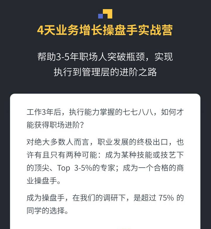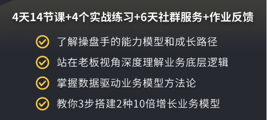 4天業(yè)務(wù)增長操盤手實戰(zhàn)營,內(nèi)含4天14節(jié)課+4個實戰(zhàn)練習(xí)+6天社群服務(wù)+作業(yè)反饋;