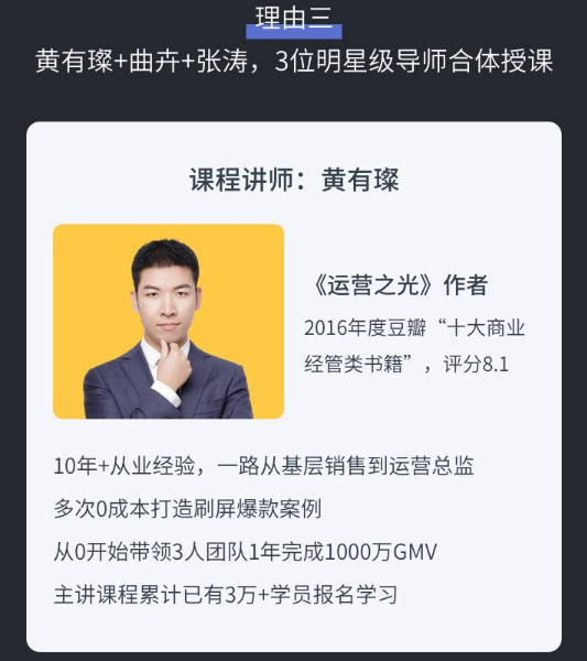 三位老師的半身像+姓名和title,告訴用戶操盤課的內(nèi)容來源正宗,由知名運營專家傳授,在第一時間向用戶傳遞課程價值;