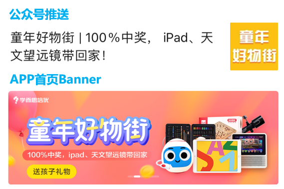 從下圖看出,推送標(biāo)題和Banner直接說(shuō)出對(duì)用戶的好處,用“100%中獎(jiǎng)”、“iPad、天文望遠(yuǎn)鏡帶回家”、”送孩子禮物“成功引起用戶的興趣點(diǎn)進(jìn)落地頁(yè)。