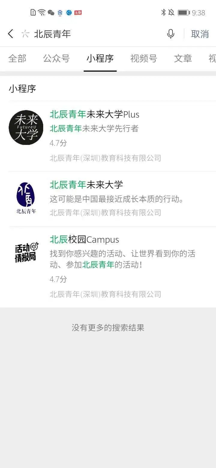 目前的小程序有三個:分別是北辰青年未來大學的Plus、北辰青年未來大學、北辰校園campus。
