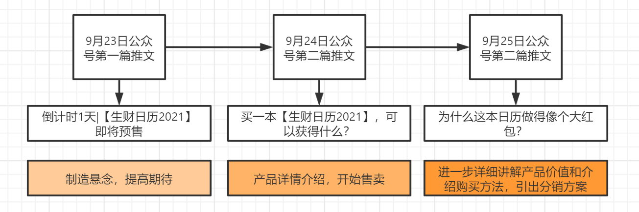 公眾號推廣步驟如上,連續(xù)3天共推送了3篇推文,從一開始的預(yù)告,到預(yù)售開啟,再到引出分銷,層層遞進,有節(jié)奏的引導(dǎo)目標(biāo)用戶購買并積極的進行推廣分銷。
