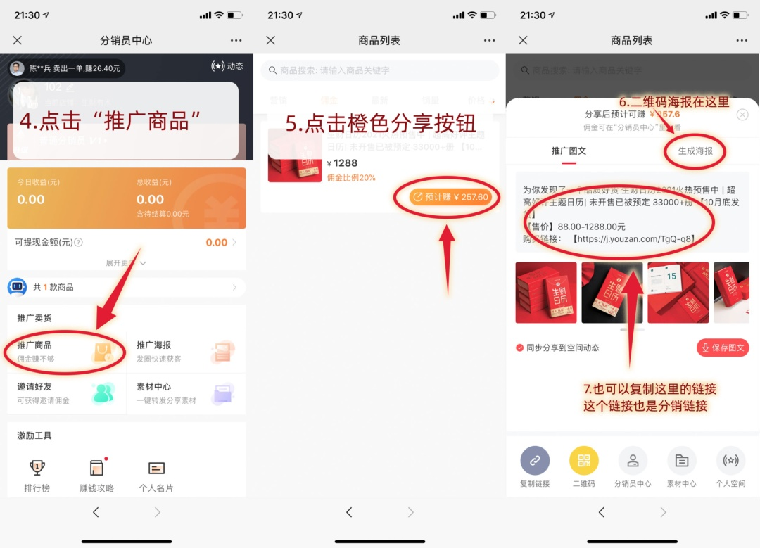 分銷模式采用了有贊的分銷功能,功能是比較強大,但因為要注冊分銷員才能推廣商品,售賣出去后還要買家確認(rèn)收貨后才可以提現(xiàn)。整個流程稍顯繁瑣,可能有的用戶看到一半就放棄分享了。