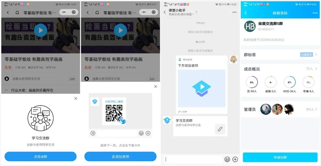 社群運營較為活躍,管理員老師會定期在群里發(fā)布免費課程消息,通知有時間和學(xué)習(xí)意向的同學(xué)去學(xué)習(xí),授課老師也會在群里對學(xué)員進行答疑解惑,同時每加入一個新人,社群管理員都會提示“歡迎新同學(xué)”,并告知材料領(lǐng)取及課程咨詢應(yīng)該找哪位老師。管理服務(wù)相對人性化。