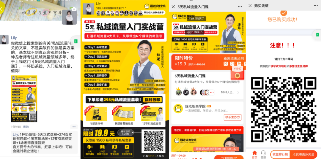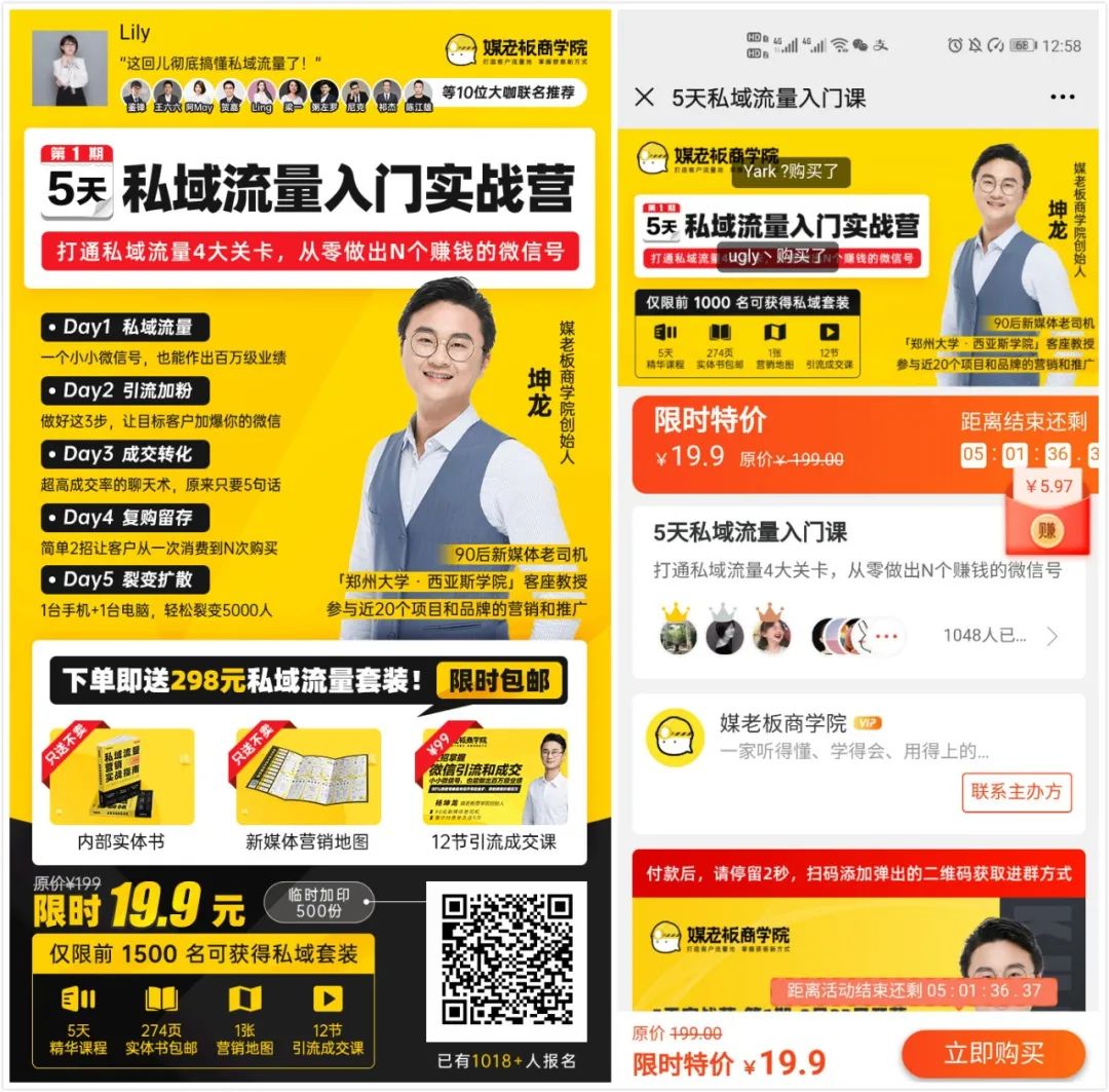 課程內(nèi)容的含金量也是滿滿,19.9元能得到的東西有:5天精華課+實體書包郵,營銷地圖,12節(jié)引流成交課,每一個東西都標明價值,如只送不賣,價值298元,價值99元,這些文案細節(jié)五一不體現(xiàn)出課程的超高含金量,直擊用戶課程超值的認知。
