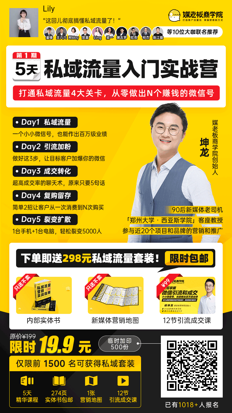 在裂變海報上也添加了制造緊迫感的元素,例如,限時19.9元、臨時加印500份、已經(jīng)有1018+人報名等。