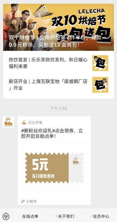 10月9日晚6:00,樂樂茶官方公眾號發(fā)出推文,官宣雙十烘焙節(jié)活動。用戶可點擊推文中8款主推軟包SKU圖片的任意位置,跳轉(zhuǎn)至點單小程序下單。未注冊會員可掃碼推文末尾醒目的二維碼進行注冊并領(lǐng)取5元無門檻優(yōu)惠券。點擊推文末尾左下角的“閱讀原文”,可跳轉(zhuǎn)至樂樂茶官方微博的本活動宣傳頁面,引導(dǎo)用戶轉(zhuǎn)發(fā)該條微博,參與曬單抽獎活動。