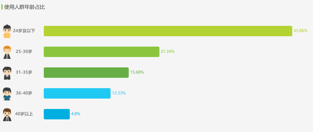 年齡:在用戶年齡分布比例上,很顯然24歲及以下的用戶最多,這是因?yàn)樽鳂I(yè)幫的最主要便是直接面向K12教育階段的青少年用戶。