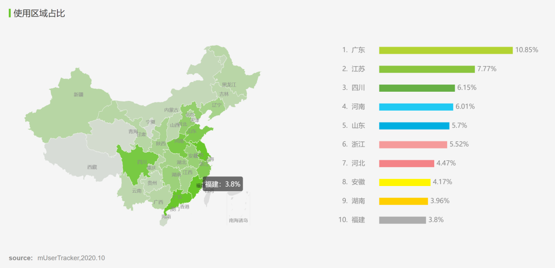 地域:作業(yè)幫的使用區(qū)域與作業(yè)幫官方宣傳的三四線小城市為主存在巨大差異,仍是以廣東,江蘇,浙江等經(jīng)濟(jì)發(fā)達(dá)地區(qū)為主,這些地區(qū)經(jīng)濟(jì)發(fā)達(dá),K12學(xué)生移動(dòng)設(shè)備持有率更高,思想也較為開(kāi)放,更易接受在線教育類(lèi)的新事物。