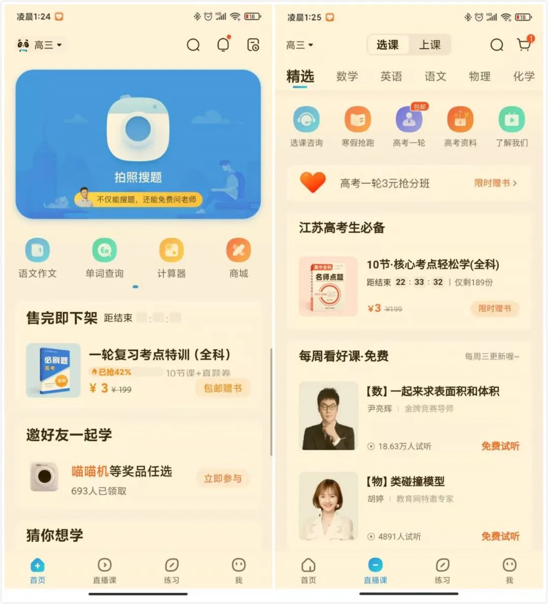 a.首頁(yè)最上的拍照搜題功能,其余頁(yè)面最終都為直播課引流