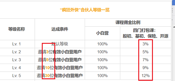 從傭金表可知,獎勵是階梯式的。邀請新用戶越多,高價課的傭金比例越高。