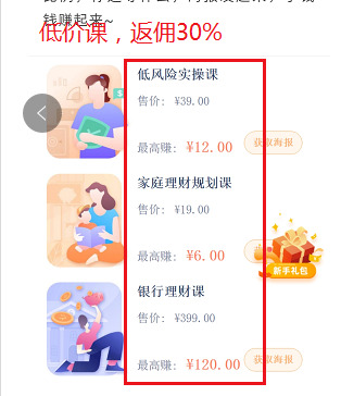 低價格的返傭比例在30%-100%不等,低價課在9元-399元,到手9元-120元/門課。