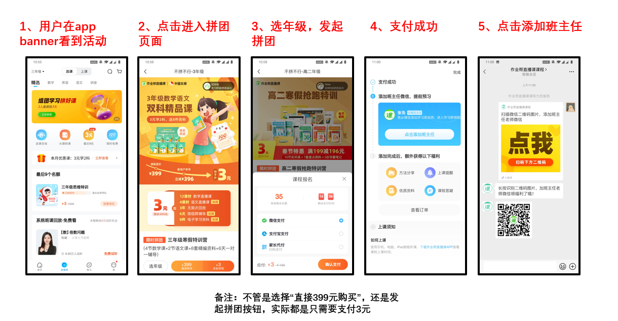 從這個玩法來倒推活動設計目的,大概可以推測出,該活動是披著拼團的外衣,實則為了降低用戶參與成本和參與難度,同時,該活動的目的就不再是拉新了,而是轉化下載過作業(yè)幫app但是從未付費的新用戶。