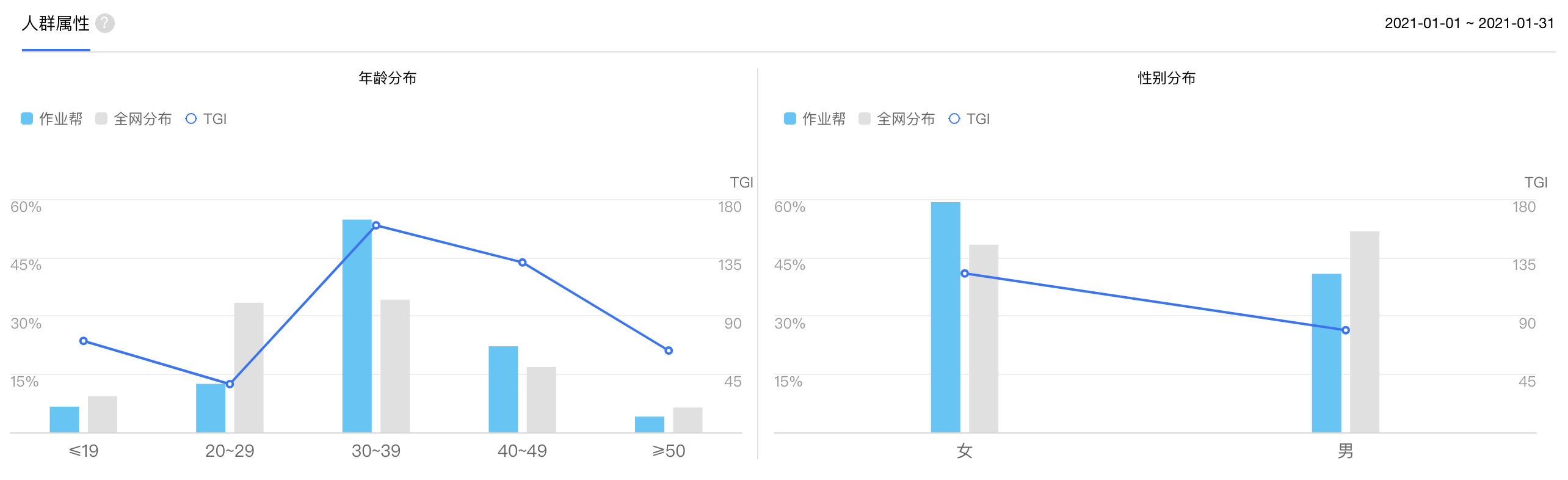 用戶年齡主要集中在30-49歲,占比74%。其中,30-39歲年齡段用戶占比達54%,基本都是80后家長人群。女性用戶占比59%,男性用戶占比41%,略低于女性用戶人群。
