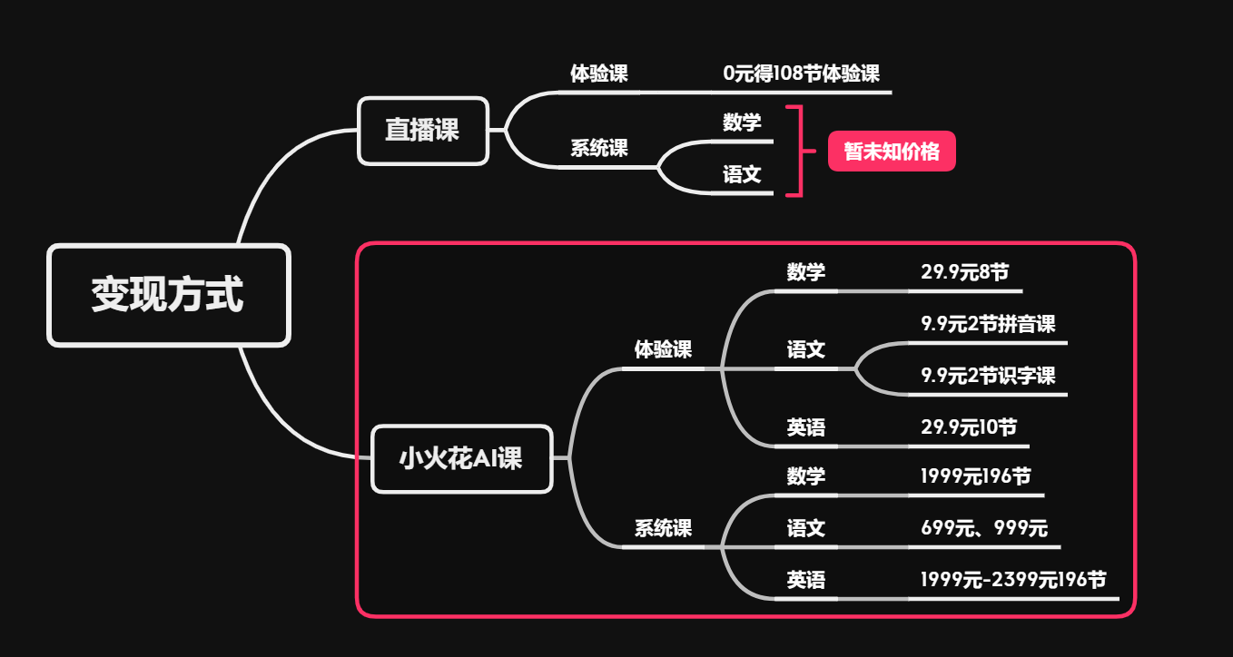 火花思維有數(shù)理思維、大語文、英語三大科目,分為直播課和小火花AI課兩種不同的上課形式兩大產(chǎn)品,覆蓋3-12歲孩子所需的知識內(nèi)容。