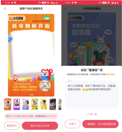 這里的精神需求主要是,用戶通過分享個(gè)性化的海報(bào)(一般帶有自己孩子的照片、上過的課程數(shù)量)到朋友圈,可以幫助自己打造一個(gè)重視孩子教育的好家長的人設(shè)形象,滿足用戶的炫耀心理。同時(shí)用戶一般都愿意將自己覺得有用的東西分享給別人,也是一種利他的行為。