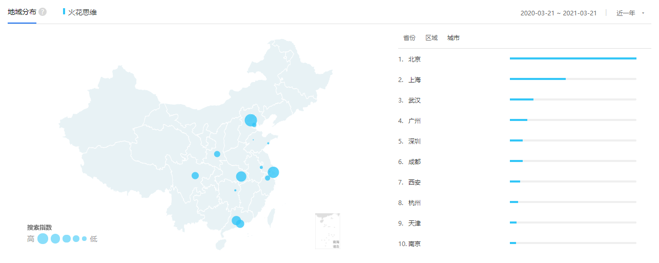 根據(jù)百度指數(shù)顯示,火花思維app的用戶群體主要幾種在北京、上海、武漢、廣州、深圳等一線城市,這部分地區(qū)的家長經(jīng)濟(jì)水平較其他地區(qū)較高,且受文化教育水平也比較高,對于3-12歲孩子的教育重視程度也高于其他三四線城市地區(qū)。