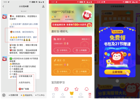 火花思維的轉(zhuǎn)介紹活動(dòng)非常多,常規(guī)的有每周任務(wù)——分享有禮,熱點(diǎn)營銷類的有“推薦好友賺學(xué)費(fèi)”、“集火花幣兌好禮”、“做任務(wù)集火花幣兌開學(xué)新裝備”、“三周年免費(fèi)領(lǐng)書包和贈(zèng)課”等等。