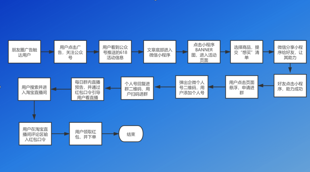 朋友圈廣告觸達用戶,用戶點擊朋友圈廣告頁關注公眾號,公眾號文章推送618預售活動信息,點擊文章底部進入小程序,用戶點擊小程序banner提交“想買”清單,微信分享小程序給好友助力,好友進入小程序助力成功;頁面彈窗引導用戶加群,彈出企微個人號邀請用戶進企微社群,用戶進群后,群內(nèi)每日提醒用戶進入淘寶直播間;