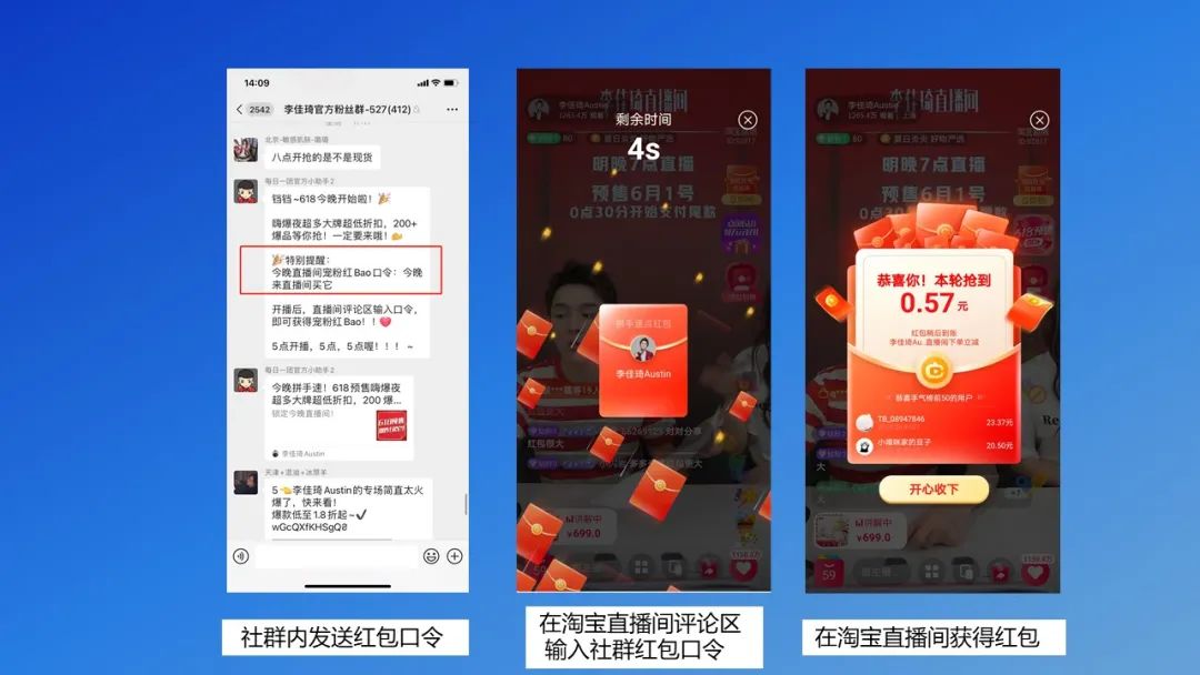 不管是618還是雙11,紅包都是攻破用戶的最后一道心理屏障。618期間李佳琦社群以專屬口令紅包為鉤子,引導用戶進入淘寶直播間,在評論區(qū)輸入社群專屬口令,即可領取紅包,完成下單抵扣。以紅包利誘,給用戶不得不看、不得不買的行動理由;