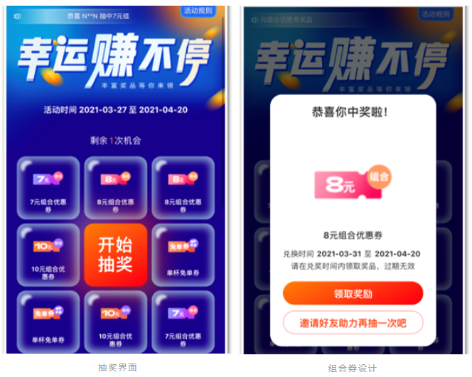 第二個路徑是所有參與的顧客,每次抽獎100%能獲得組合優(yōu)惠券。而本次活動所有優(yōu)惠券,都是下次到店?可使?,側(cè)向拉動線下?店的復(fù)購率。