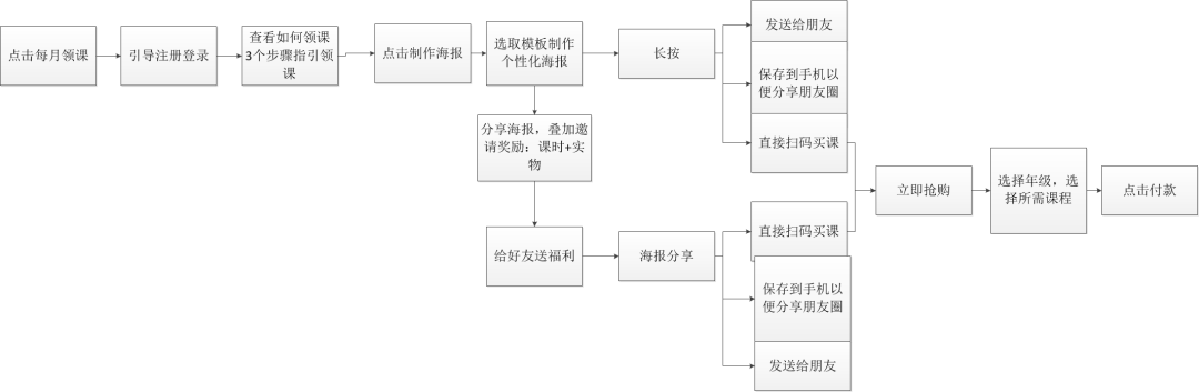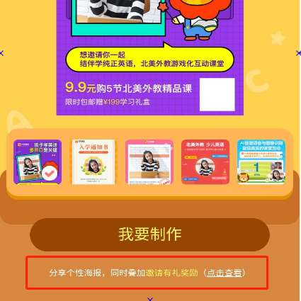 比火花思維多的一點(diǎn)是,在海報(bào)分享時(shí),還強(qiáng)調(diào)了邀請(qǐng)好友有禮,包括課時(shí)獎(jiǎng)勵(lì)和實(shí)物獎(jiǎng)勵(lì),頁(yè)面文案布局很贊清晰,引導(dǎo)也很自然,很好提高了轉(zhuǎn)化率