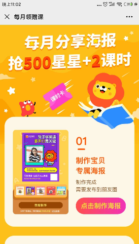 ?1、進(jìn)入每月領(lǐng)課部分,首先內(nèi)容明確利益點(diǎn):每月分享海報(bào),搶500星星+2課時(shí)。