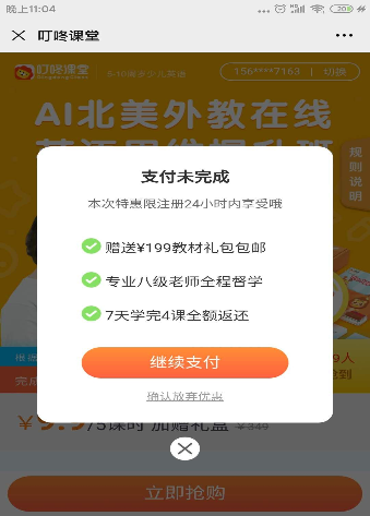 3、在用戶未支付執(zhí)行反退操作時(shí),彈框彈出強(qiáng)調(diào)用戶此次付費(fèi)的理由:贈(zèng)送199元教材包郵,專(zhuān)業(yè)八級(jí)老師全程督學(xué),7天學(xué)完4課全額返還,著重強(qiáng)調(diào)本課程實(shí)在是太實(shí)惠了,不免讓人心動(dòng)。——精細(xì)化召回用戶(本次特惠限注冊(cè)24小時(shí)內(nèi)享受,明顯是針對(duì)新用戶),且利用價(jià)格錨定效應(yīng)(9.9元與199元對(duì)比)促進(jìn)轉(zhuǎn)化