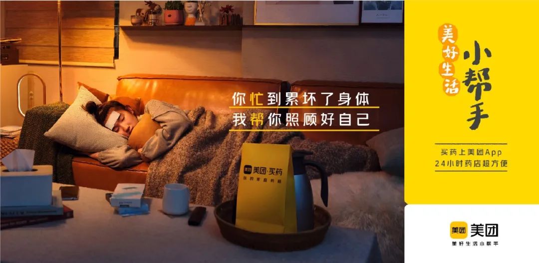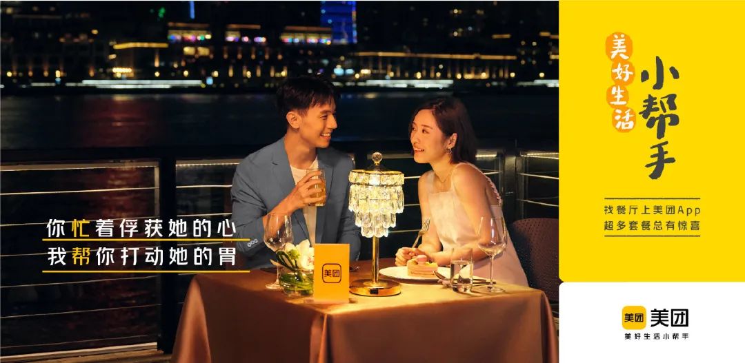 線上除了發(fā)布溫情短片外,美團還發(fā)布一組配套海報,提煉短片中的場景:外賣、團購、玩樂、酒店、打車等不同業(yè)務(wù)板塊,對「美好生活小幫手」的新定位進行拆解,將在生活各個側(cè)面提供的“幫”集中放大,增強對美團多元化業(yè)務(wù)價值的認知。