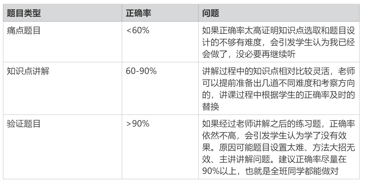 常用的外化效果邏輯為:痛點(diǎn)題目引入 - 知識(shí)點(diǎn)講解 - 驗(yàn)證題目。且可以用知識(shí)點(diǎn)正確率來(lái)驗(yàn)證題目設(shè)計(jì)是否合理和老師講授是否有效