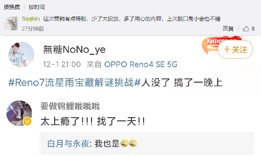 最后,作為一場(chǎng)跨平臺(tái)整合營(yíng)銷活動(dòng),OPPO發(fā)起的這場(chǎng)「流星雨寶藏解謎挑戰(zhàn)」以“流星雨”為線索串聯(lián)起了微博、微信、淘寶等各官方平臺(tái)以及各領(lǐng)域KOL,并將本輪Reno7新品上市的各階段和各渠道的素材、內(nèi)容也加入進(jìn)來(lái),實(shí)現(xiàn)了資源最大化利用,在促進(jìn)品牌曝光的同時(shí)也為平臺(tái)引流,可以說(shuō)是一次品牌新品營(yíng)銷創(chuàng)新之舉。