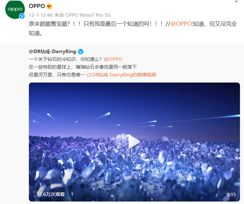 其次,OPPO Reno7的產(chǎn)品價(jià)值也在活動(dòng)過(guò)程中充分展現(xiàn)。在整體營(yíng)銷活動(dòng)中,流星雨出現(xiàn)在每一個(gè)環(huán)節(jié),從與中國(guó)國(guó)家天文合作,科普流星雨知識(shí),到與DR鉆戒合作,將鉆石類比為流星雨,再到引用《流星雨》等大熱歌曲,OPPO將流星雨作為謎底,真正讓目標(biāo)成為答案;除此之外,產(chǎn)品信息和品牌過(guò)往動(dòng)態(tài)也成為了隱藏線索的地方,用戶在參與每一個(gè)Reno7創(chuàng)意的同時(shí),也在過(guò)程中回顧了品牌的過(guò)往。