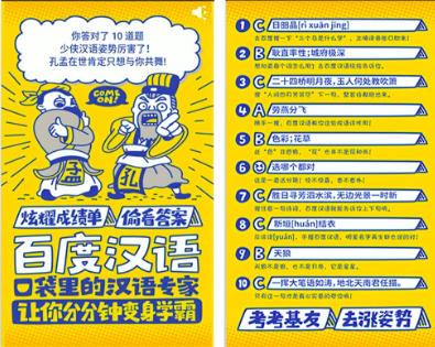 前幾年,百度漢語曾在讀書日推出一款刷爆朋友圈的測(cè)試答題H5——《30秒測(cè)出你是真學(xué)渣還是假學(xué)霸》,H5上共有10道漢語知識(shí)題,內(nèi)容既有日常生活兒女情長(zhǎng)的古詩詞,也有《人民的名義》、《速8》等熱門影視劇,甚至還有白百何等明星娛樂八卦,可謂現(xiàn)實(shí)生活版語文試卷。