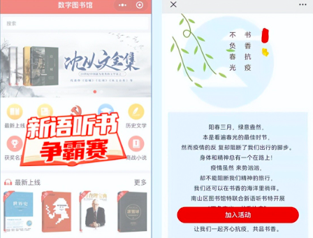 深圳南山圖書館“不負(fù)春光,書香抗疫”聽書打卡挑戰(zhàn)賽。參與者每日在新語聽書活動(dòng)界面時(shí)長(zhǎng)累計(jì)達(dá)30分鐘即視為當(dāng)日打卡成功,參與者聽書的總時(shí)長(zhǎng)也會(huì)被記錄到后臺(tái)系統(tǒng),最后根據(jù)打卡天數(shù)及聽書時(shí)長(zhǎng)進(jìn)行評(píng)選,打卡天數(shù)越多排名越靠前,打卡天數(shù)相同,聽書時(shí)長(zhǎng)越長(zhǎng)排名越靠前。