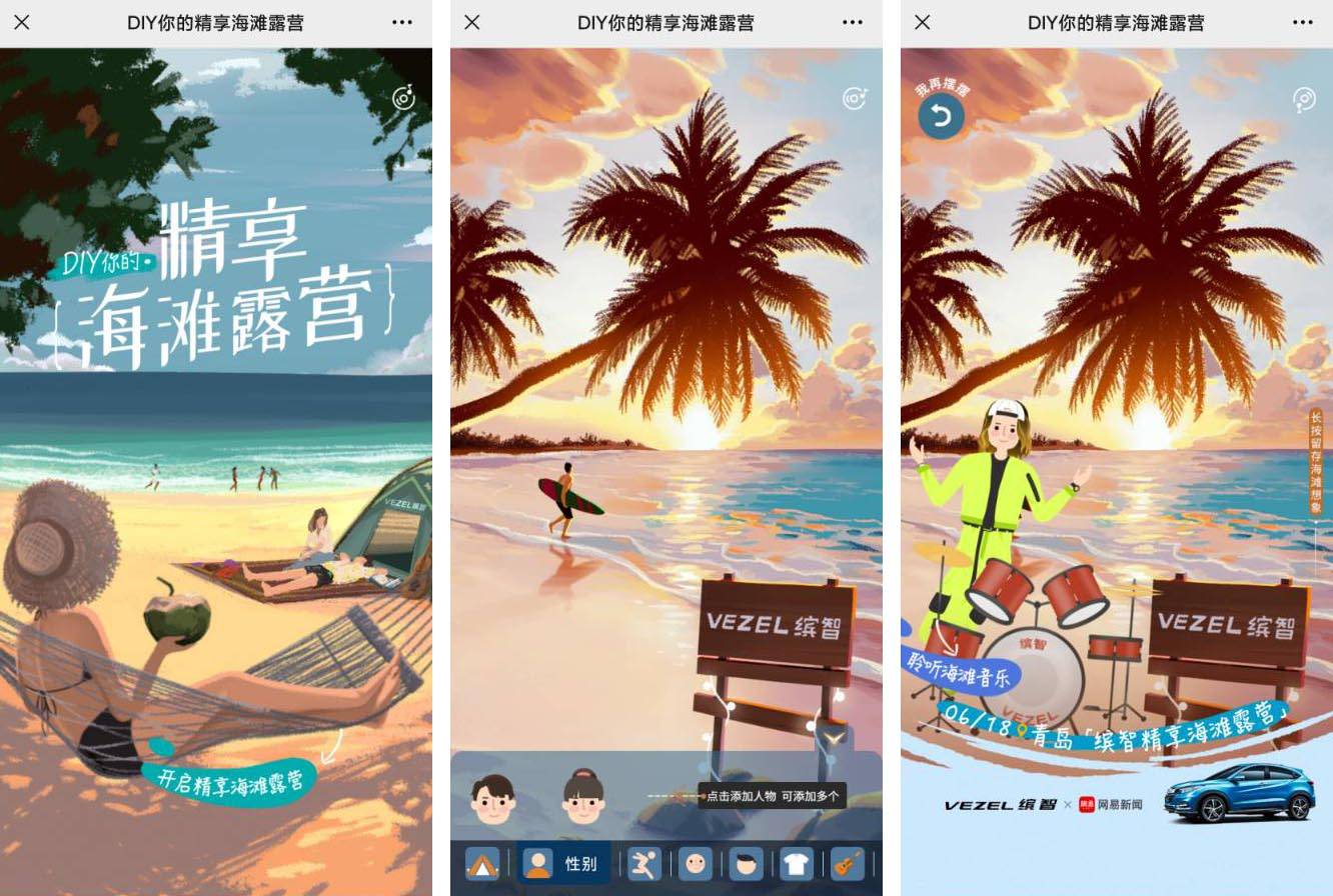 案例參考:這是由繽智汽車為618海灘繽紛露營推出的DIY海報生成H5,邀請用戶DIY自己的露營造型,提前感受露營的自由爽快。迎合大家對夏日露營的熱情,為活動預(yù)熱。H5中包含場景、性別、動作、發(fā)型、服裝、表情、裝飾品、燈牌等多個DIY元素,讓各種性格的用戶都能找到符合自己審美偏好的效果。