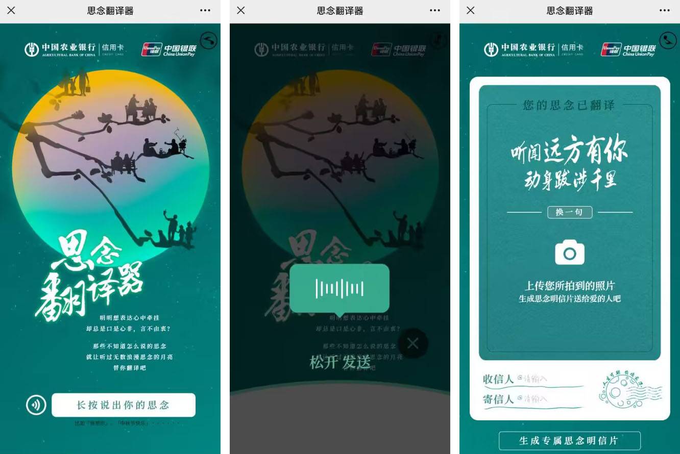 案例參考:這是由中國農(nóng)業(yè)銀行信用卡與中國銀聯(lián)聯(lián)合推出的H5海報生成器,以“思念翻譯器”為主題,需要讓用戶說出一句思念的話,上傳照片生成相應(yīng)的中秋節(jié)思念海報,借中秋之際傳遞思念,獲得更多的品牌曝光。