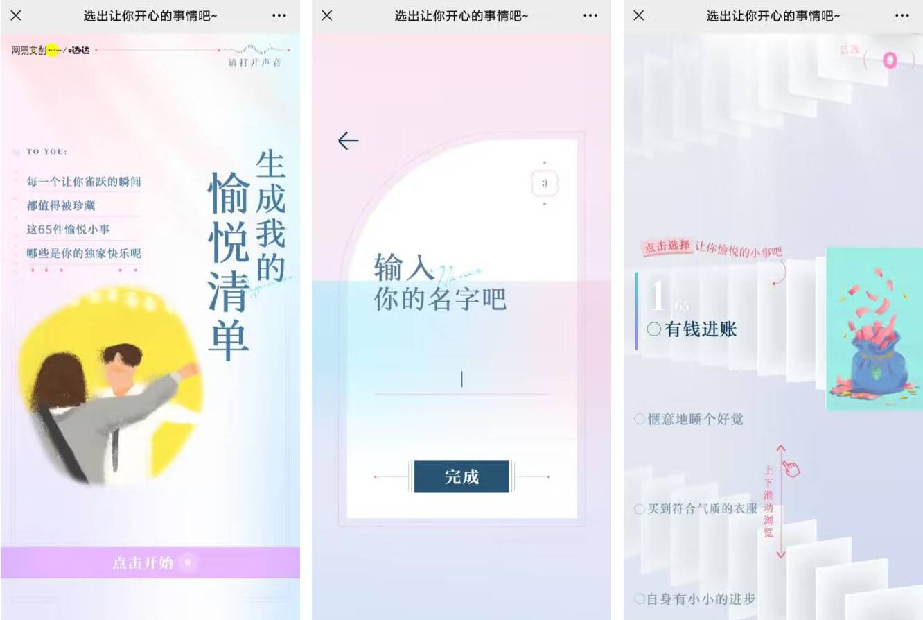 案例參考:這是由網(wǎng)易推出的清單海報生成H5,很多人都很容易沉浸在負(fù)面情緒中,許多美好的事情都被忽略了,H5列舉了65件美好小事,一定有一些是發(fā)生在你身上的,邀請用戶參與清單海報生成H5活動,一起回憶、規(guī)劃和實(shí)踐。