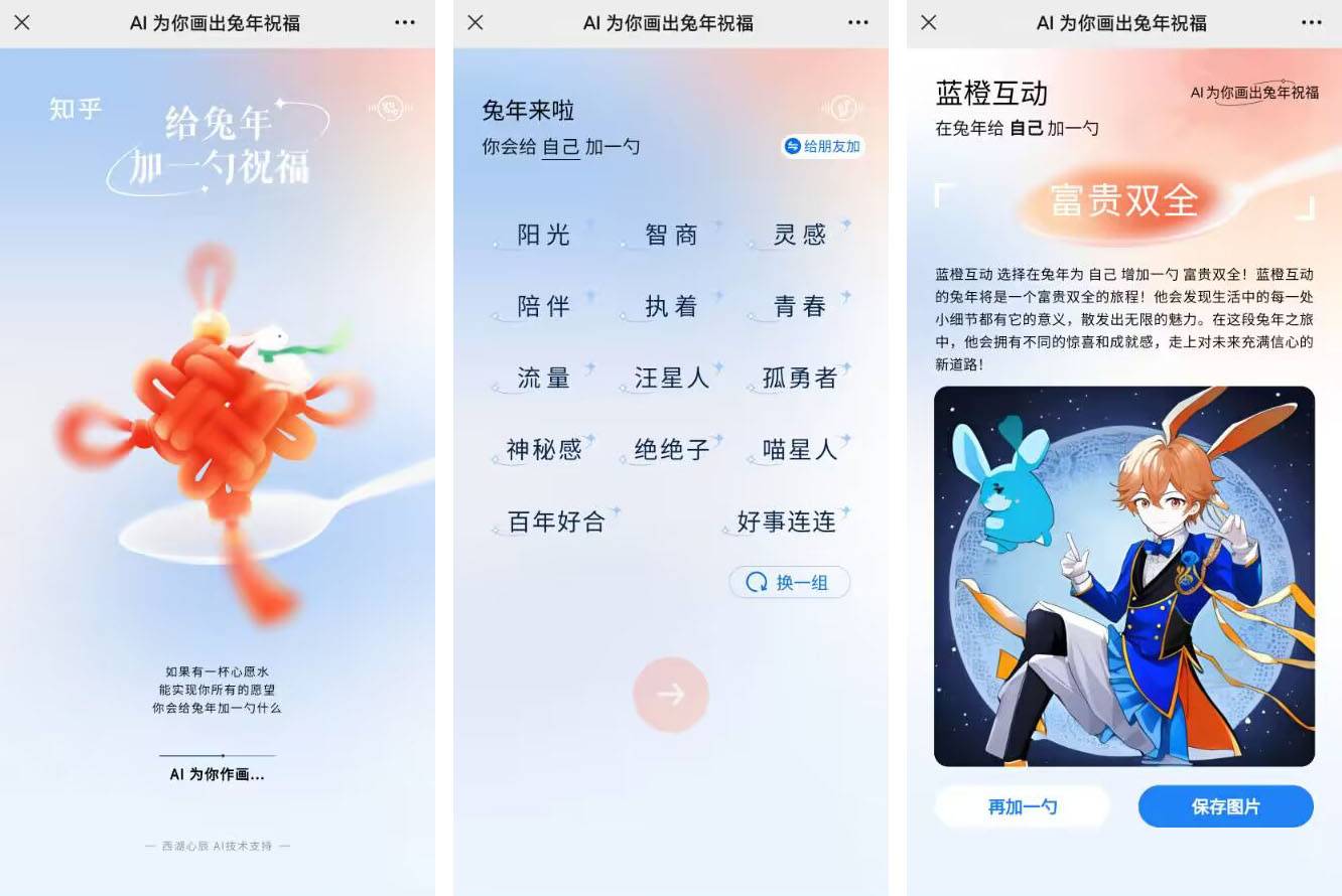 活動詳情:這是由知乎在2023年春節(jié)之際推出的AI作畫H5活動,以“AI為你畫出兔年祝福”為主題,通過讓用戶選擇關(guān)鍵詞,選擇送祝福的人,用AI生成一段兔年祝福話術(shù)和一幅卡通漫畫。依靠用戶分享實現(xiàn)節(jié)日期間的品牌裂變傳播。進(jìn)入H5案例,加載頁拋出活動主題,如果有一杯心愿水,給兔年加一勺祝福,能實現(xiàn)你所有的愿望,你會給兔年加一勺什么?從給定的關(guān)鍵詞中選擇一個,如“健康”、“平安”、“中彩票”、“好睡眠”等等,用戶可自有切換挑選,然后點擊確定按鈕,輸入自己的昵稱,即可生成專屬AI繪畫。
