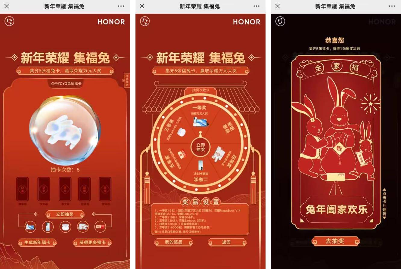 活動詳情:榮耀品牌在2023年春節(jié)之際推出的「新年榮耀 集福兔」創(chuàng)意H5作品。通過讓用戶集福兔,進(jìn)行抽獎,過程中植入榮耀各種電子產(chǎn)品,形成有效曝光和品牌傳播。首次進(jìn)入H5活動時,每位用戶默認(rèn)有5次抽卡機(jī)會,點擊YOYO兔即可抽取??ǎ看纬楠劧紩@得一張卡牌,正面是榮耀產(chǎn)品介紹,背面是一個福兔。用戶可在福卡中點擊“生成新年???rdquo;生成活動海報進(jìn)行分享。抽卡機(jī)會使用完后可點擊“獲得更多???rdquo;進(jìn)入每日任務(wù)獲取抽獎機(jī)會。集齊5個福兔可以進(jìn)行一次大轉(zhuǎn)盤抽獎,獲得的獎品將在“我的獎品”列表里展現(xiàn)。