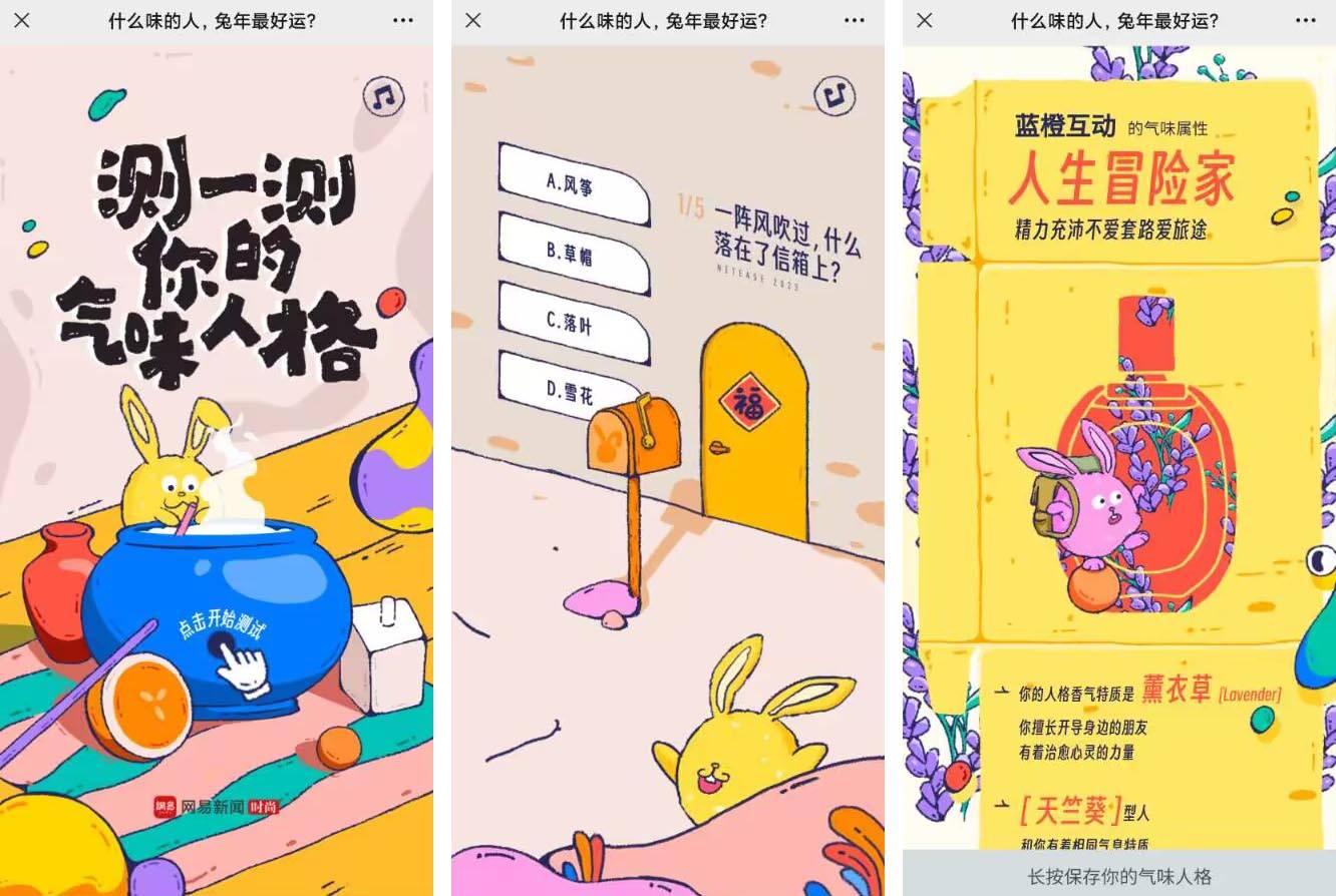 活動詳情:這是由網(wǎng)易時尚推出的春節(jié)H5活動,以“測一測你的氣味人格”為主題,融入原創(chuàng)兔年生肖主題形象,以氣味為抓手,圍繞“家”的意向場景,激發(fā)用戶的情緒共振。進(jìn)入H5案例,首頁先引用跳躍的字體和跳動的小幅畫面向用戶解釋了“普魯斯特”效應(yīng),然后帶入主題邀請用戶進(jìn)行測試。點擊開始后進(jìn)入答題頁面,根據(jù)出現(xiàn)的問題選擇符合自己性格審美的答案即可,一共有六道問題,包括什么東西飄落到了信箱上,怎么安排自己的假期,漂亮的花花擺放在哪里,想要買什么顏色的沙發(fā),ta給你帶了什么禮物,選擇一個喜歡的花瓶樣式。完成答題后輸入用戶昵稱,生成測試結(jié)果海報,包括用戶的氣味屬性、人格特質(zhì)和氣味人格成分百分比。