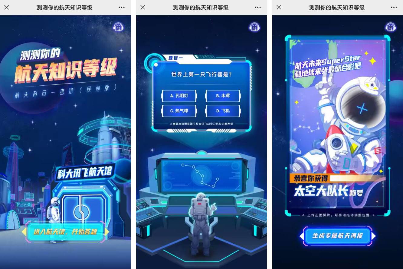 項目亮點:這是由航天文創(chuàng)CASCI和科大訊飛聯(lián)合推出的知識競賽H5,借助神十二回歸地球的熱點新聞開展航天知識科普活動,傳播科學思想、弘揚科學精神。進入H5案例,首先是一段關于太空的文案,一名穿著宇航服的人走進了航空館,邀請用戶參與航天知識競賽,測試自己的航天知識等級。一共7個關于太空和宇航問題,每個問題有2-4個選項,每回答一個問題,下方的北斗七星會有提示,答對為綠色小圓點,答錯為小紅點。問題回答完畢后將生成航天知識等級海報,根據用戶答對的問題數評測不同的稱號。