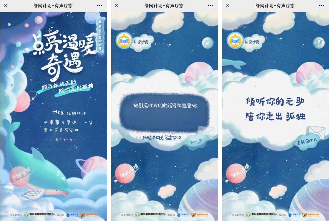 活動亮點(diǎn):國家心理健康和精神衛(wèi)生防治中心與阿里安全聯(lián)合推出的公益H5,以“綠網(wǎng)計劃-有聲療愈”為主題,借用守護(hù)生命健康大使林志玲、佟大為的磁性聲音,介紹關(guān)于抑郁情緒的療法,讓大家了解抑郁癥,呼喚大家對抑郁癥患者更耐心,更有愛。H5采用了雙套UI設(shè)計,當(dāng)用戶進(jìn)入H5時,會隨機(jī)打開藍(lán)色主題或者綠色主題的UI界面,很有意思,界面多變,聲音好聽,立意積極正能量,能吸引更多用戶參與傳播。交互上主要采用了點(diǎn)擊、輸入和長按。無論是背景音樂還是語音活動介紹的聲音都非常治愈,著實能影響心情和情緒。