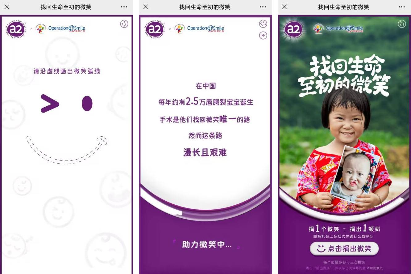 活動亮點(diǎn):這是一次呼喚大家關(guān)愛唇腭裂寶寶的公益行動,普及唇腭裂對嬰兒成長帶來的各方面困擾,以及進(jìn)行修復(fù)手術(shù)的阻礙,用成功修復(fù)唇腭的小朋友淳樸的微笑打動用戶,鼓勵用戶用自己的微笑為公益助力。在大眾認(rèn)知中,唇腭裂是外形困擾,H5將其帶給嬰兒的成長困擾告訴大家,會讓用戶更了解這次活動的意義,更滿懷保護(hù)欲的去幫助那些需要找回原始微笑的小天使們。每有一位用戶照片上傳,a2都會捐出一頓奶粉,用微笑守護(hù)寶寶的理念很溫暖,實打?qū)嵉哪谭劬柚顒雍軐嵲?,兩項結(jié)合,相信每位用戶都會被打動,樂意參與,幫助小嬰兒的成就感也能給自己帶來精神撫慰。