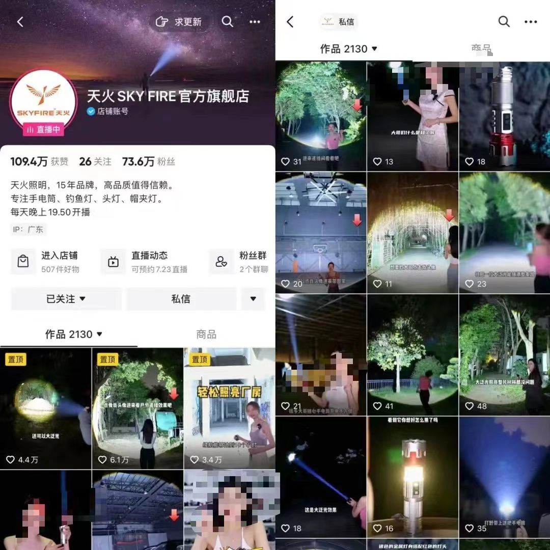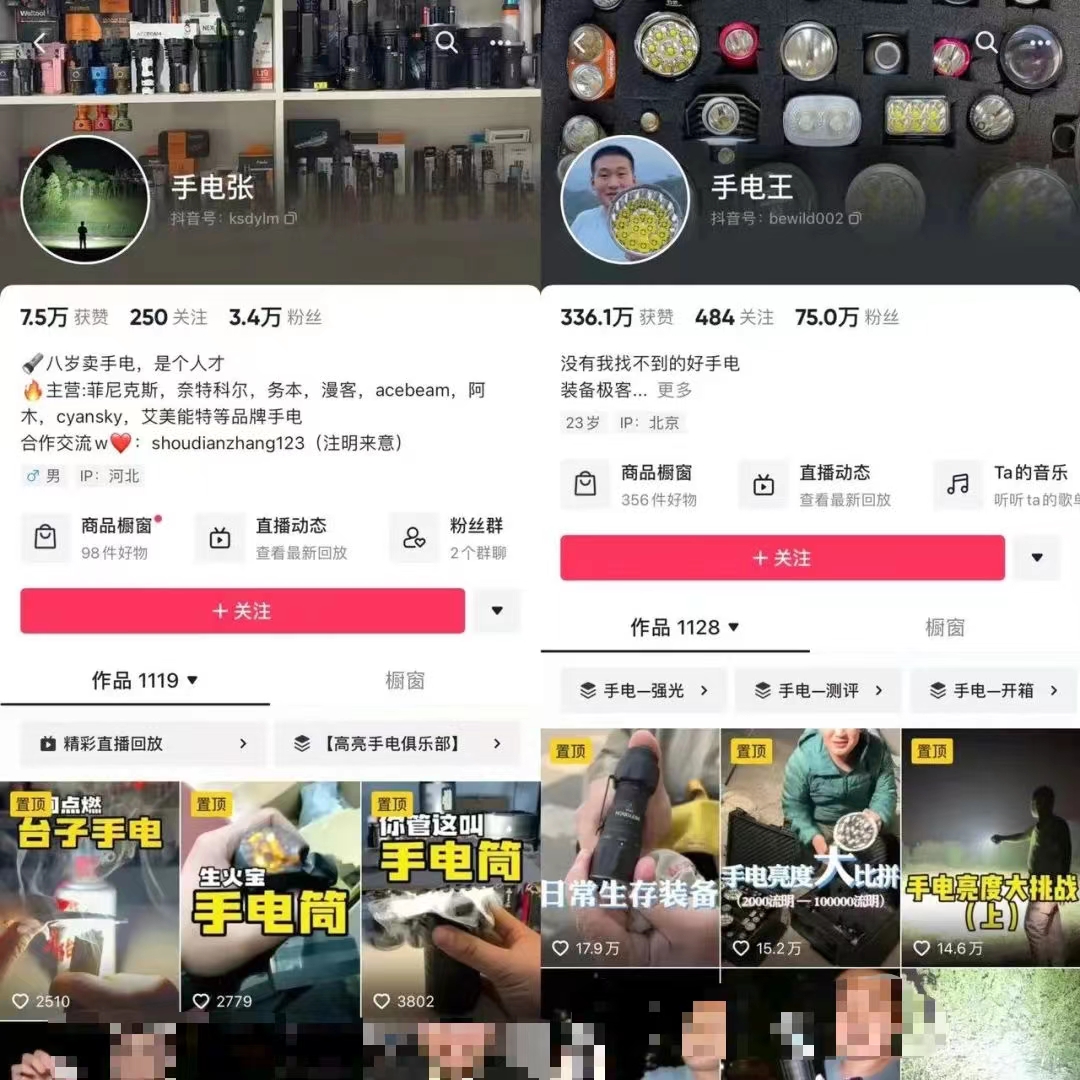 比如搜救手電、公園手電、狩獵手電、騎行手電等等,其中一個(gè)賬號(hào)的粉絲量高達(dá)70多萬(wàn)。