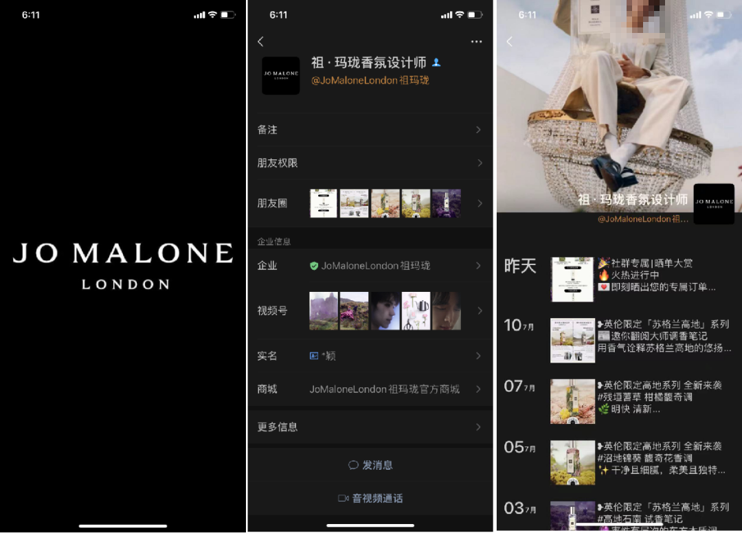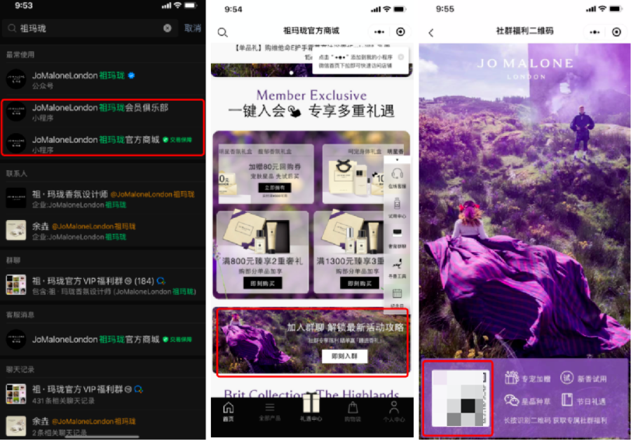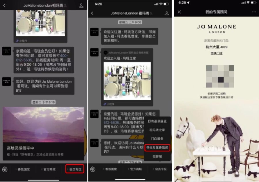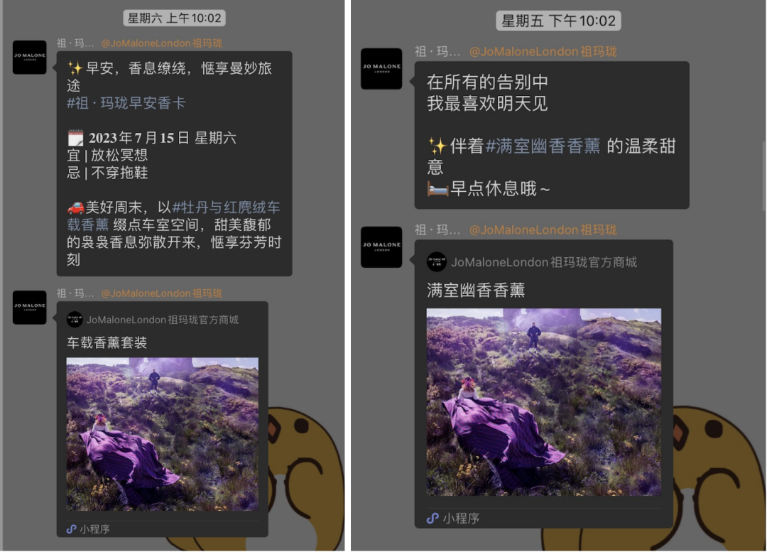 「JoMaloneLondon祖瑪瓏」公眾號(hào)在打招呼語跟菜單欄中都設(shè)置了私域社群的引流入口具體路徑: